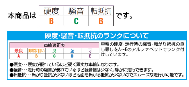 | 耐熱温度 | -20~60℃(45℃以上では負荷容量が減少します。) | タイヤ硬度 | 92ショアA |
