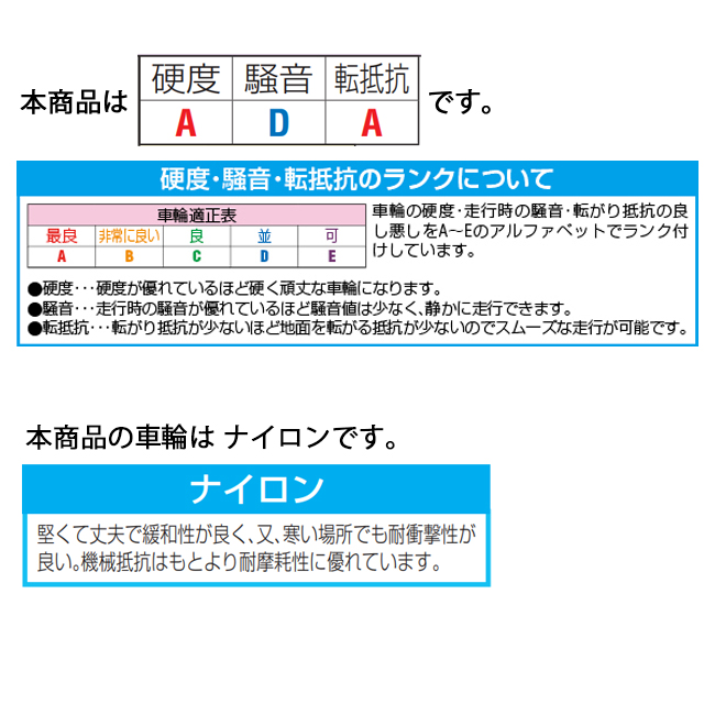 | 材質 | 金具:スチール (亜鉛メッキ、青色不動態化処理、六価クロムフリー) 車輪:ナイロン6 |