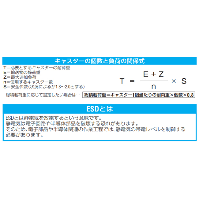 | 用途 | 半導体・電子部品工場、精密機器の搬送に | 仕様 | 自在車輪(ストッパー無し、導電性仕様) |