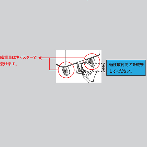 | 【ご使用のチェックポイント】 ●適正取り付け高さ(H)を厳守して下さい。 ・適正取付高さ<キャスター取付高さ⇒ブレーキストッパー側の取付高さを調節してください。 ・適正取付高さ>キャスター取付高さ⇒キャスター側の取付高さを調節してください。 ●本体を持ち上げる目的でのご使用はおやめ下さい。 ●総荷重(本体重量+積載重量)はキャスターで受けます。 |