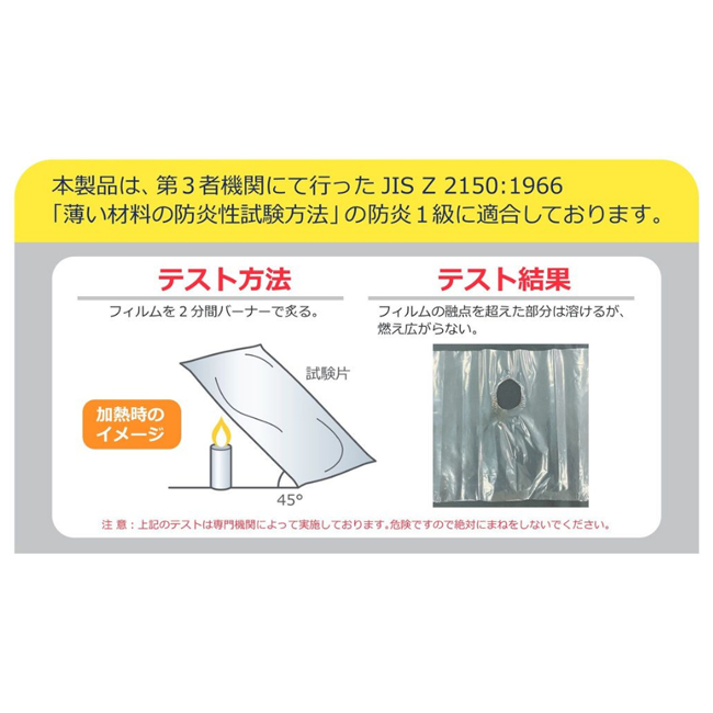 | 本製品は、第3者機関にて行ったJIS Z 2150:1966「薄い材料の防炎性試験方法」の防炎1級に適合しています。 | |||