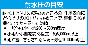 | 耐水圧 | 5,000mm | 材質 | 表:ポリエステル 裏:ポリ塩化ビニールコーティング |