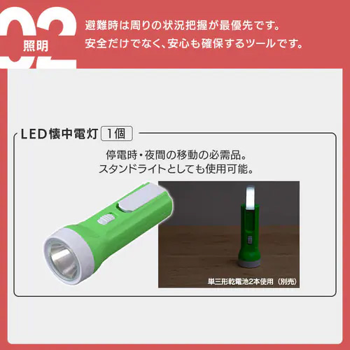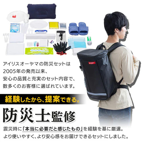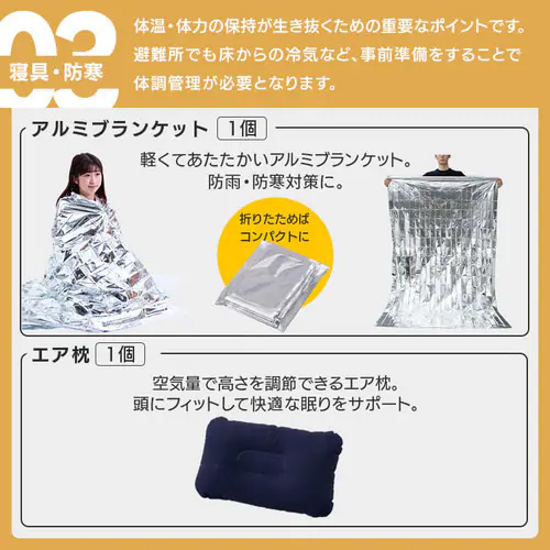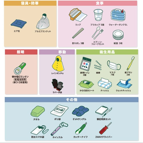 | セット内容 | 27アイテム ・アルミブランケット×1個 ・エア枕×1個 ・ラップ(30cm×8m)×1本 ・プラカップ×5個 ・折りたたみ式ウォータータンク(5L)×1個 ・紙皿×3枚 ・スプーン、フォークセット×1セット ・割りばし×3膳 ・懐中電灯ランタン(単3電池×2本/別売)×1個 ・レインポンチョ×1着 ・ラバー手袋×1セット ・携帯トイレ(3個入)×1セット ・綿棒×20本 ・マスク(7枚入)×1袋 ・歯ブラシ(3本)×1セット ・からだ拭きシート(50枚入)×1個 ・ティッシュ×1個 ・ウェットティッシュ(10枚入)×1個 ・タオル×1枚 ・ポリ袋×3枚 ・EVAサンダル(26cm)×1足 ・筆記用具セット×1セット ・防水スマホ袋×1個 ・ホイッスル×1個 ・カッターナイフ×1個 ・2WAYドライバー×1個 ・避難用リュック |