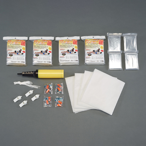 セット | 1.エアーマット×4個 2.簡易アルミ毛布×4枚 3.不織布シーツ×4枚 4.空気入れ×1個 5.防災用ホイッスル×4個 6.耳栓×4セット 7.安否確認ガイド×1枚 |